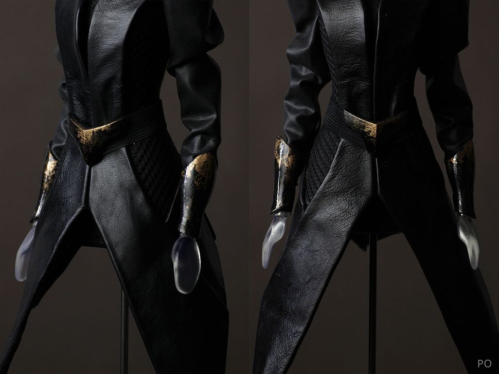 Cuir, sky, maille technique, caoutchouc. Les détails de la ceinture et des protège-bras sont imprimés en PLA puis peints, usés et vernis.