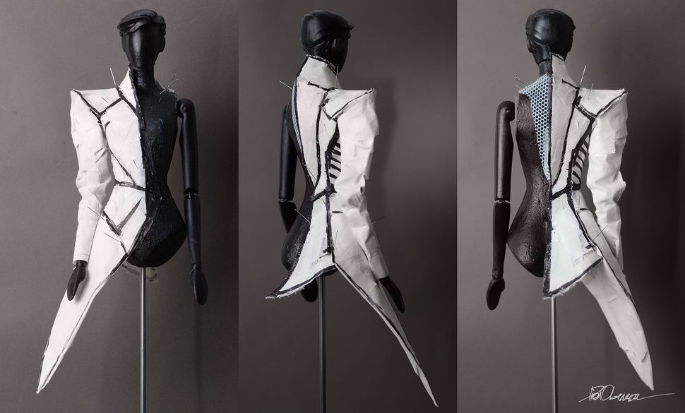 Des croquis préliminaires sont traduits en prototypes en papier, adhésif de masquage et popeline de coton drapés sur forme. Ces prototypes sont ensuite démontés et aplatis pour en tirer des patrons. Ces patrons sont enfin utilisés pour réaliser les maquettes finales de vêtements.
