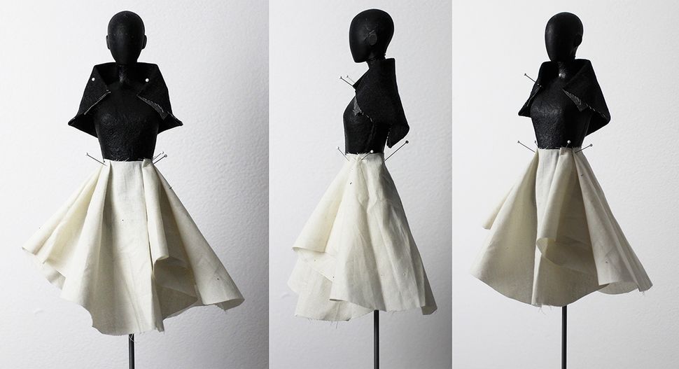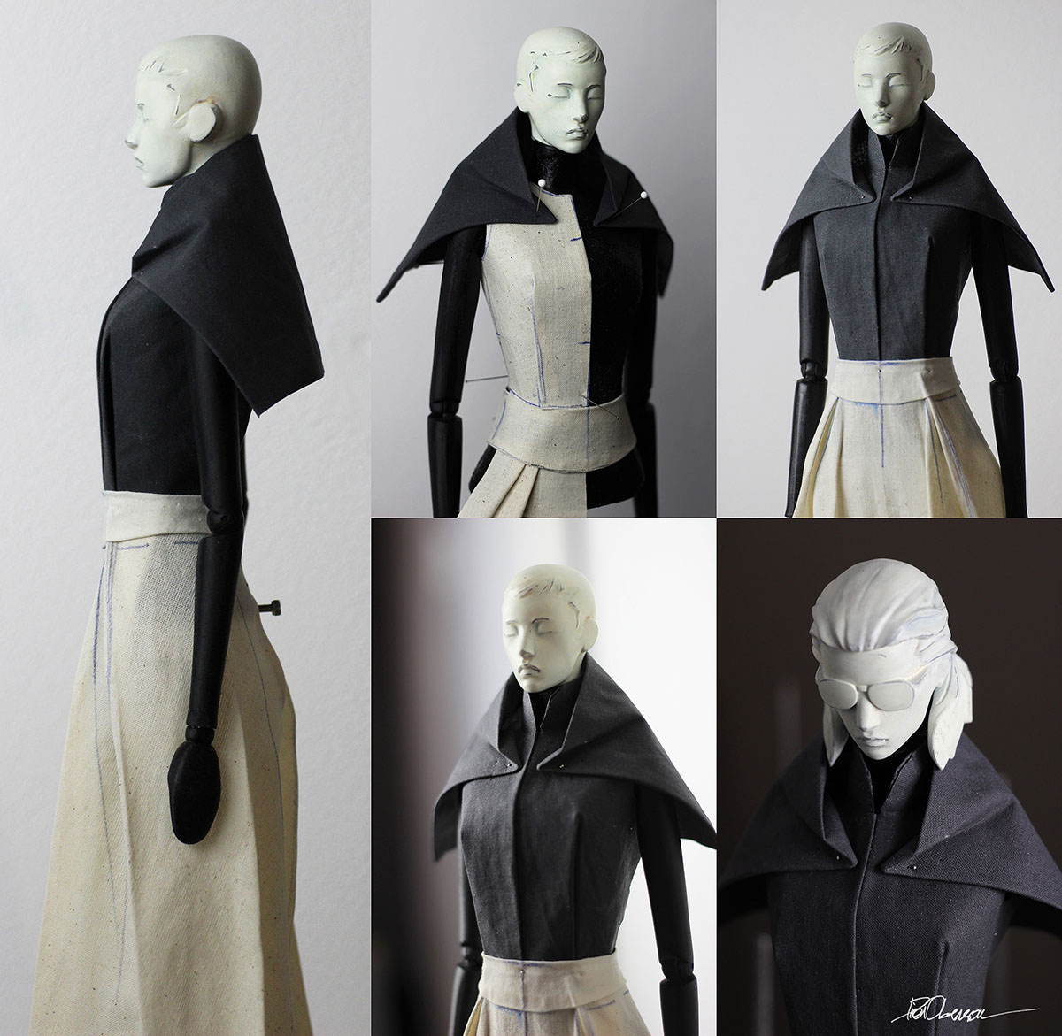 A series of physical maquettes built over custom 1:4 and 1:3 dress forms. These are exercises in garment design, pattern making, and construction at a small scale. The reduced scale allows for fast iterative work.