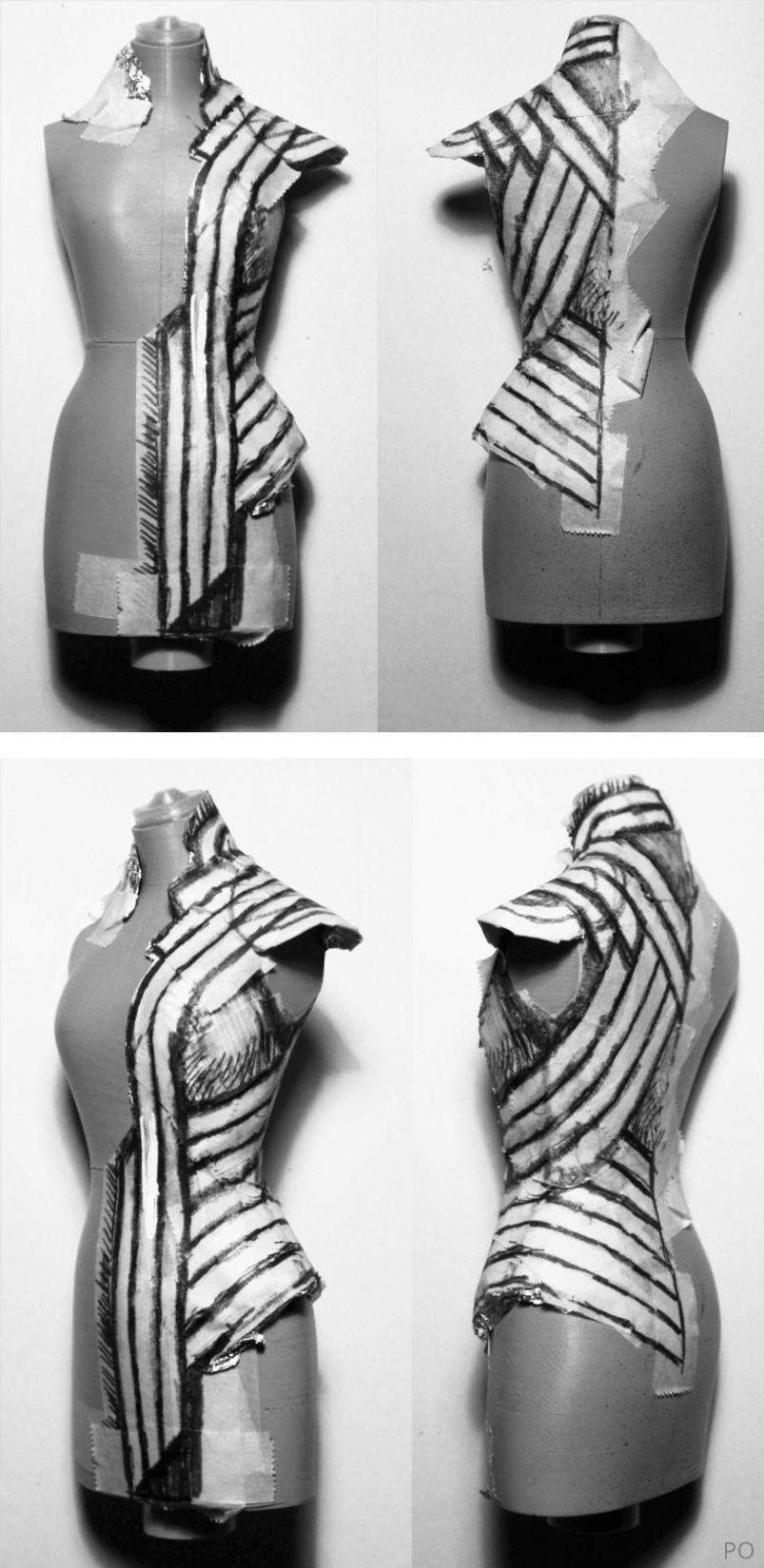 Preliminary sketches are interpreted as toile drafts draped over the dress form. These drafts are made of paper, masking tape and muslin and are then dismantled and flattened out as patterns, which are then progressively refined.