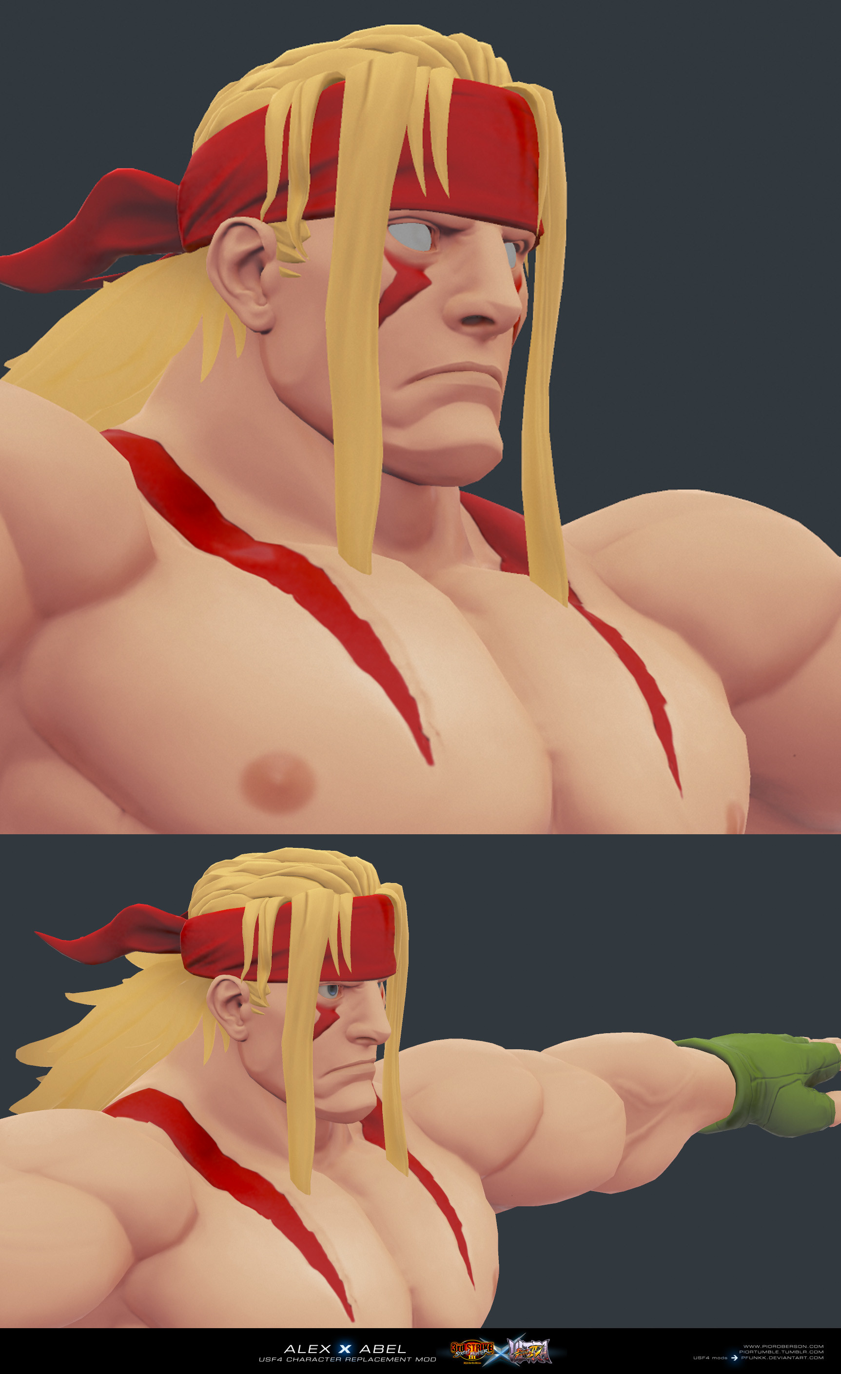 The mod replaces Abel in SFIV and later the default Alex in SFV with an Alex model created from scratch in the likeness of its pixel art design fom SFIII.