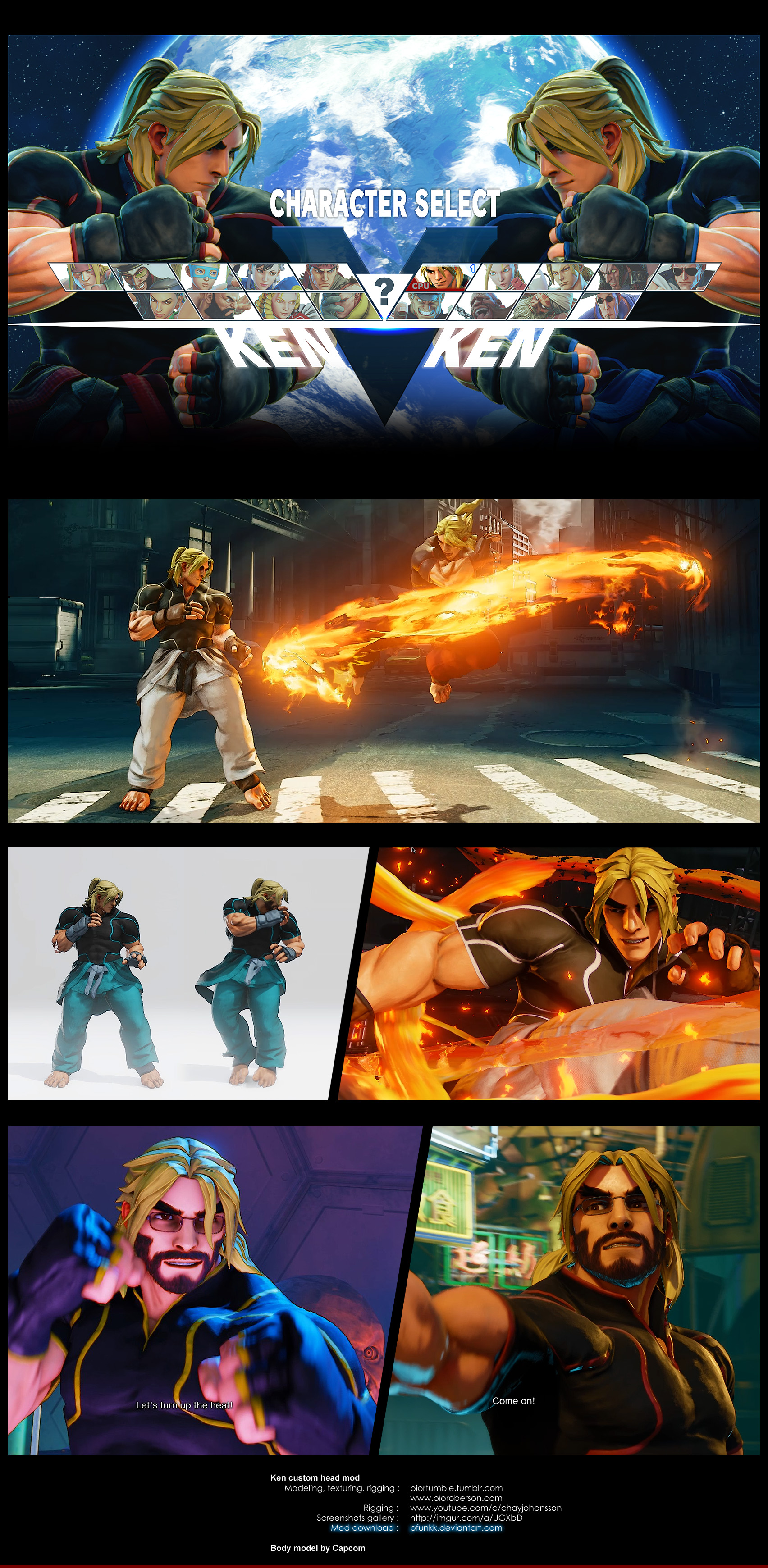 Replaces the default SFV Ken head and hair with a custom model inspired by the classic look of the character and the likeness of the Street Fighter Legacy actor Christian Howard, and also introduces a "Maximilian Dood" variant with glasses and beard. The in-game body is left untouched.