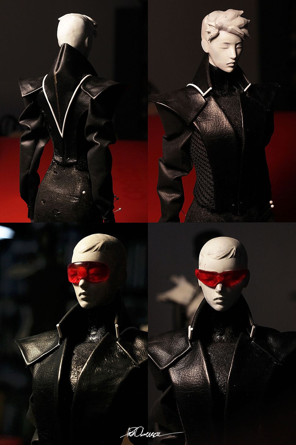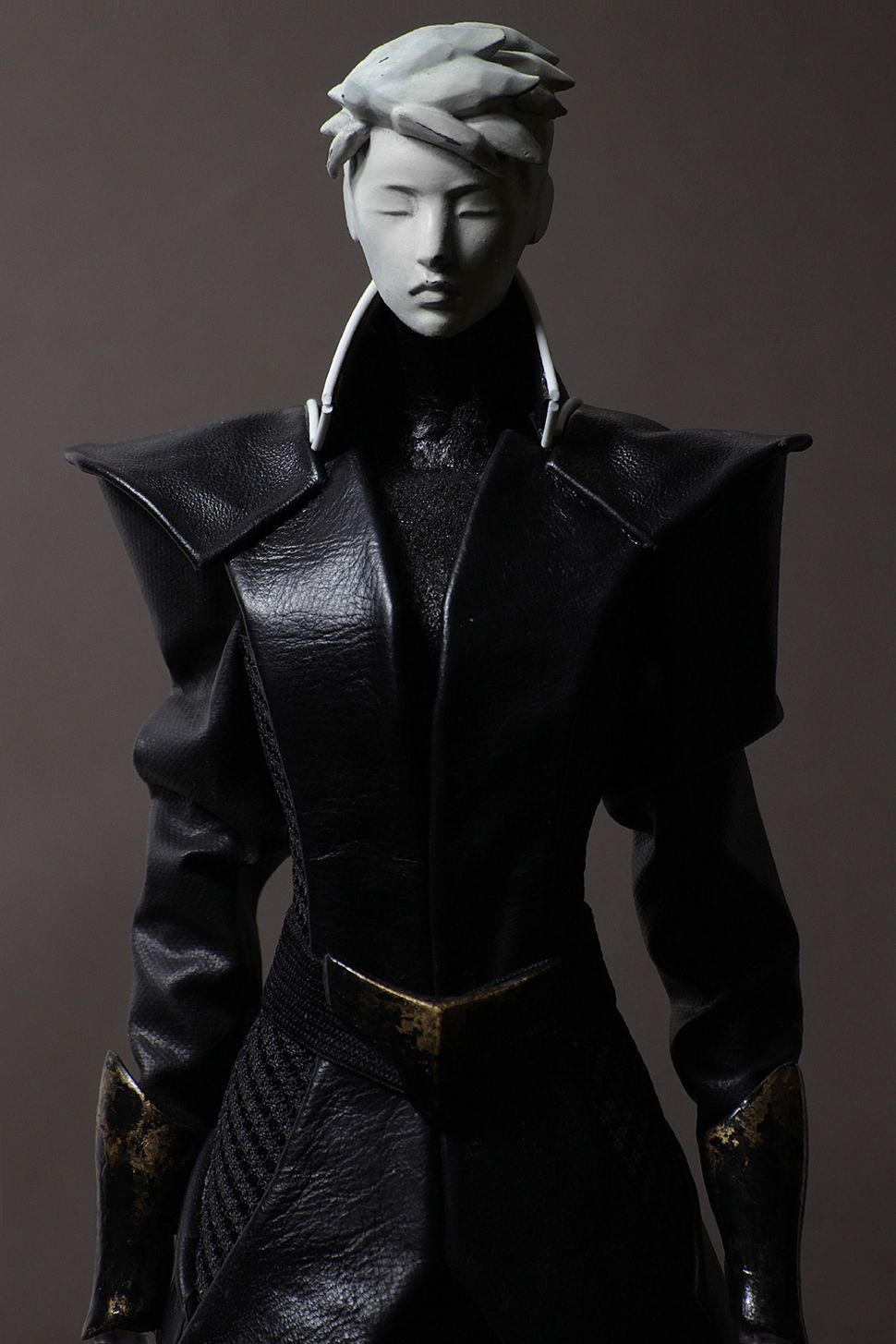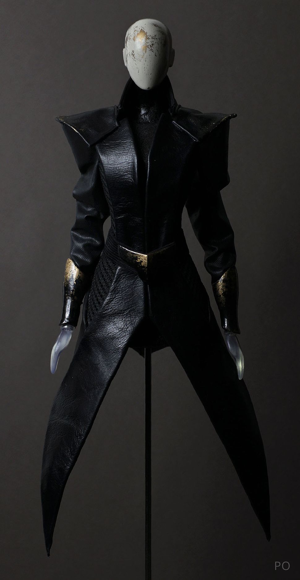 Cuir, sky, maille technique, caoutchouc. Les détails de la ceinture et des protège-bras sont imprimés en PLA puis peints, usés et vernis.
