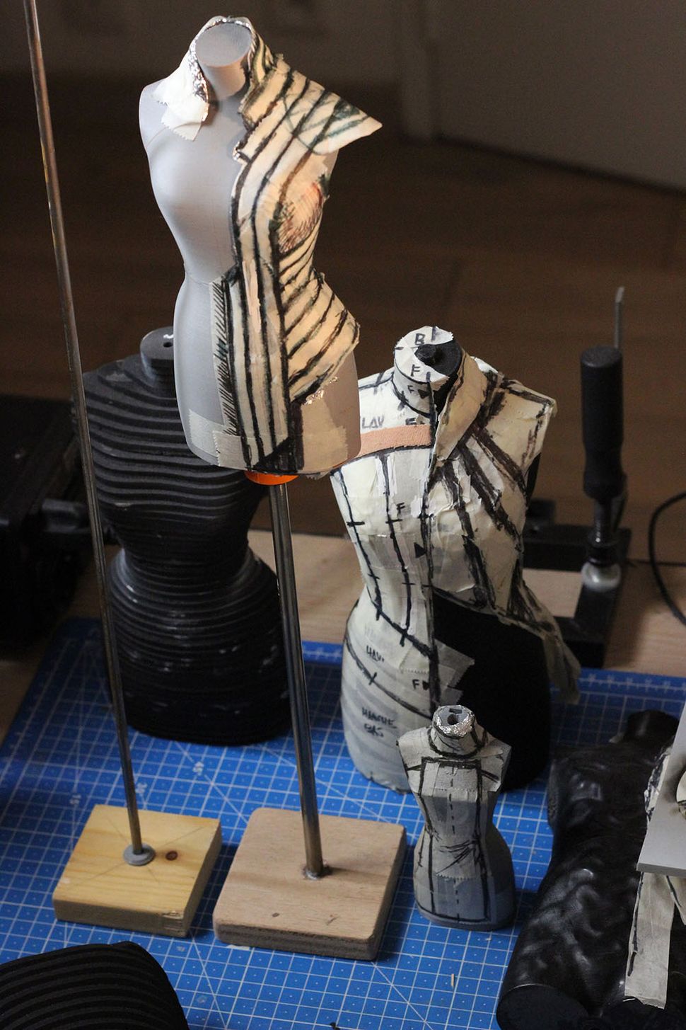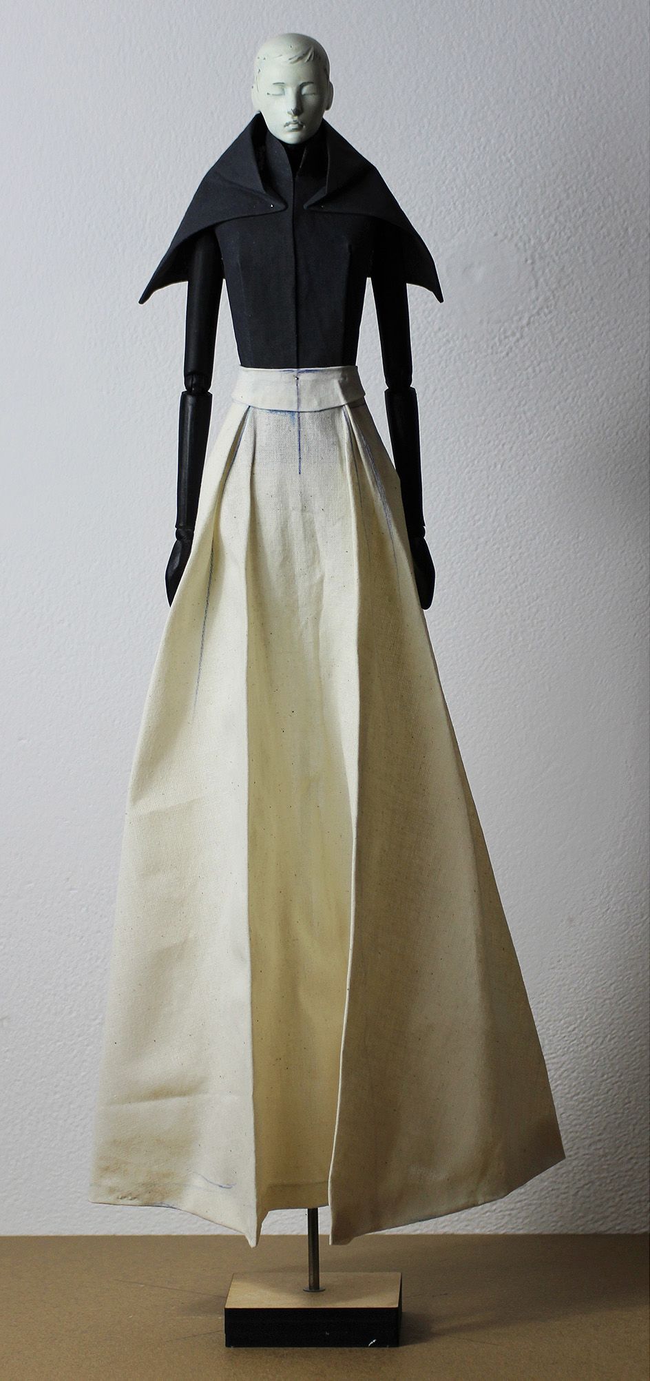 Une série de maquettes sur buste de couture à échelle 1/4 and 1/3. La taille réduite permet de travailler sur le design, le patronnage et la fabrication de façon aisée et simultanée.