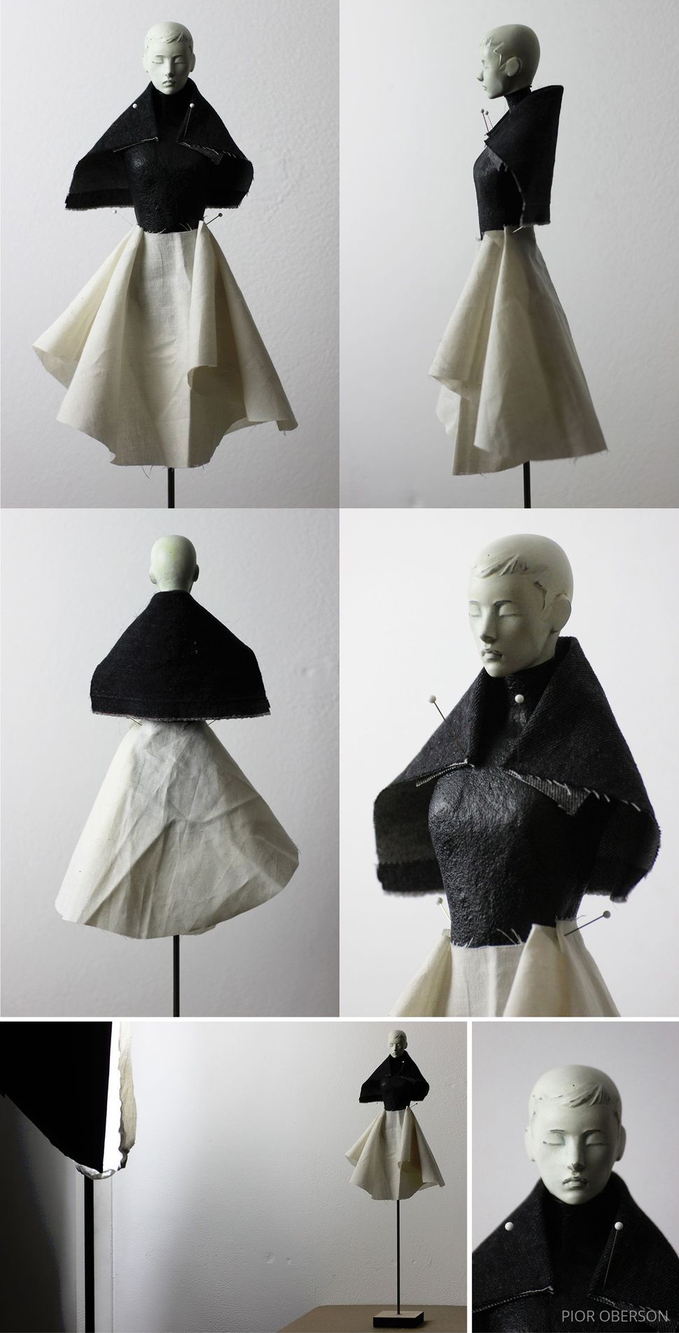 A series of physical maquettes built over custom 1:4 and 1:3 dress forms. These are exercises in garment design, pattern making, and construction at a small scale. The reduced scale allows for fast iterative work.