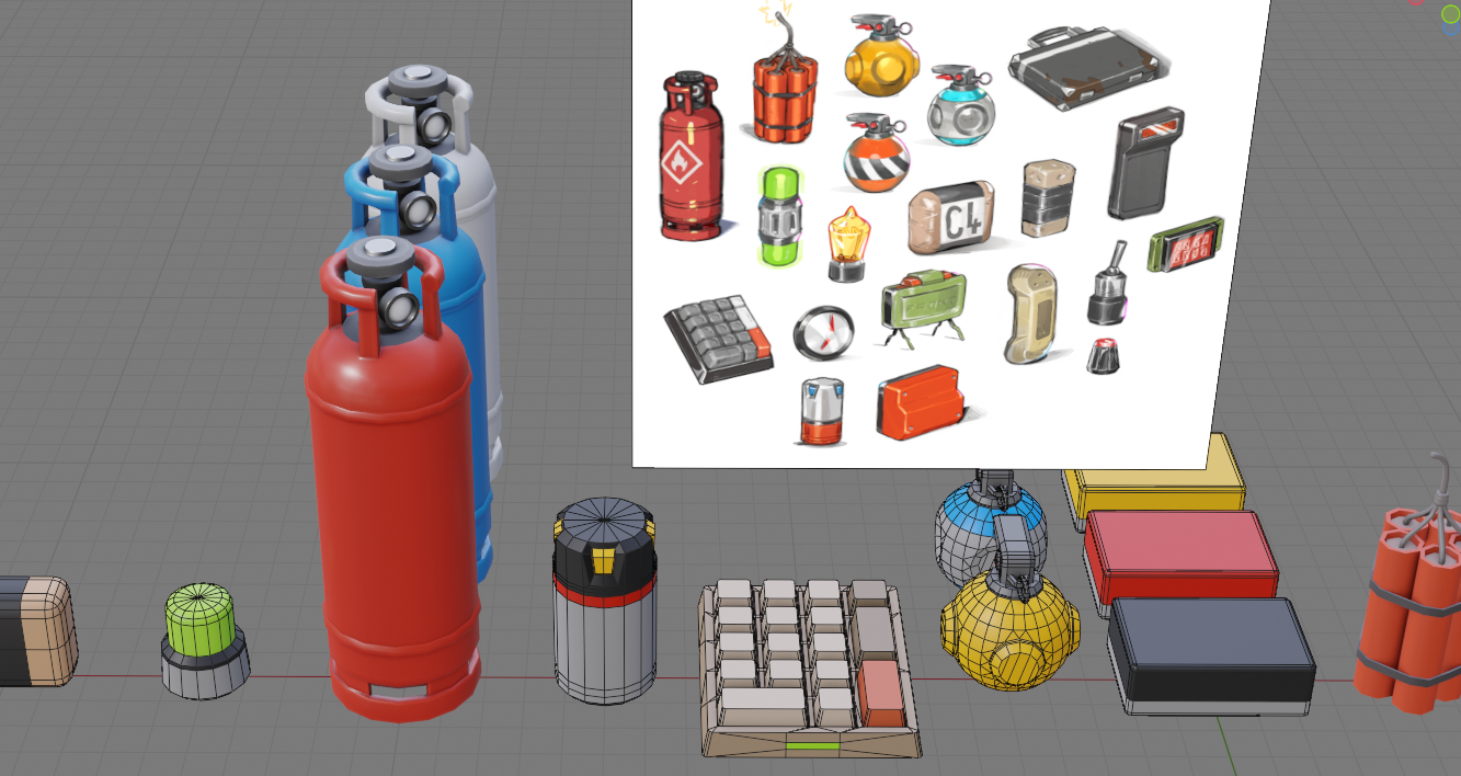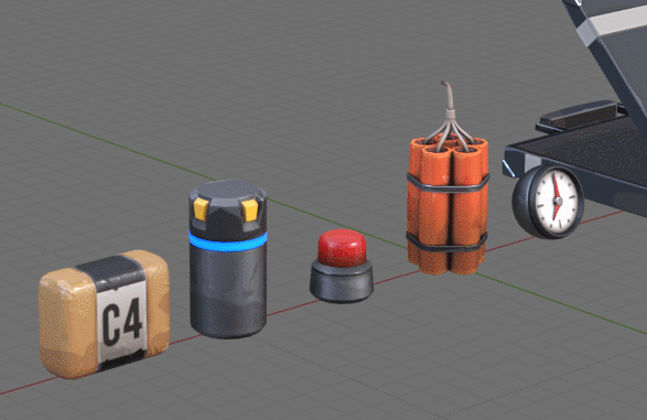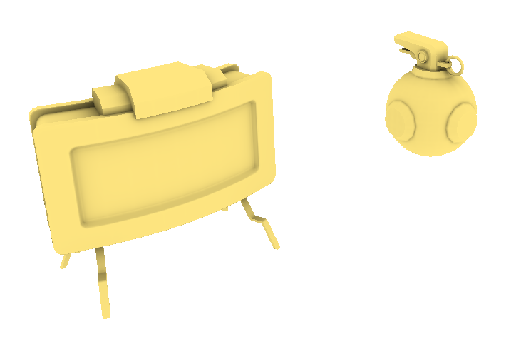 Some of the raw geometry and UVs of these assets is outsourced based on the provided concept sheets. Then UVs are furthered tweaked and texturing is done. Here the modeling of the keypad, yellow grenade, dynamite pack, claymore, modem and LCD unit were outsourced.