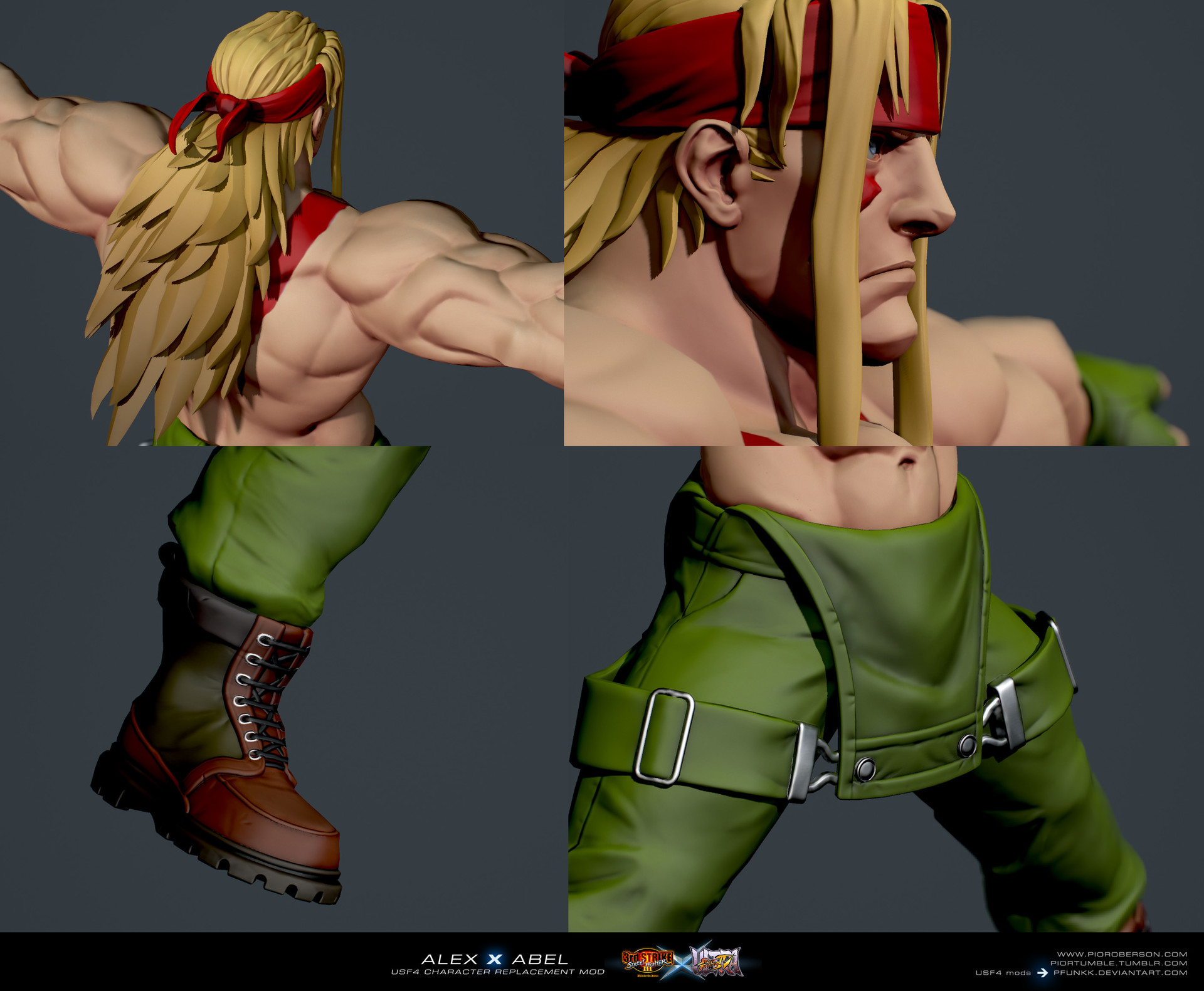 The mod replaces Abel in SFIV and later the default Alex in SFV with an Alex model created from scratch in the likeness of its pixel art design fom SFIII.