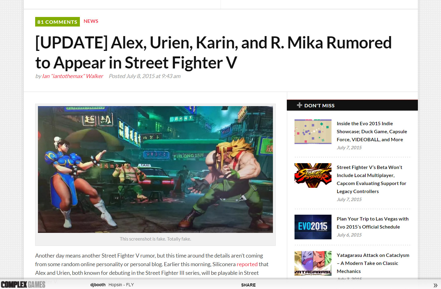 Une anecdote : peu après avoir posté une capture d'écran simulant le modèle inséré dans un décor de SFV, l'image a été relayée par un site d'infos pour illustrer la rumeur de l'apparition officielle du personnage dans le jeu ... qui n'a eu lieu que bien plus tard.