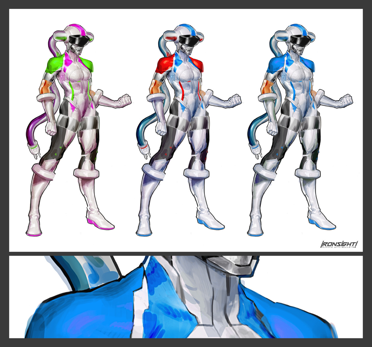Ironsight! is an ongoing personal project set in a colorful neo-90ies universe. It is a collection of character designs and sketches defining the visual vocabulary of a fictional action-oriented game IP.