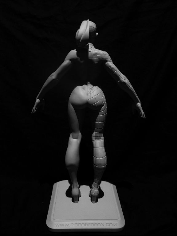 Une moitié du corps a un rendu lisse mettant l'accent sur la stylisation et les caractéristiques de la surface ; l'autre montre un réseau topologique de référence pour la modélisation et l'animation 3D.